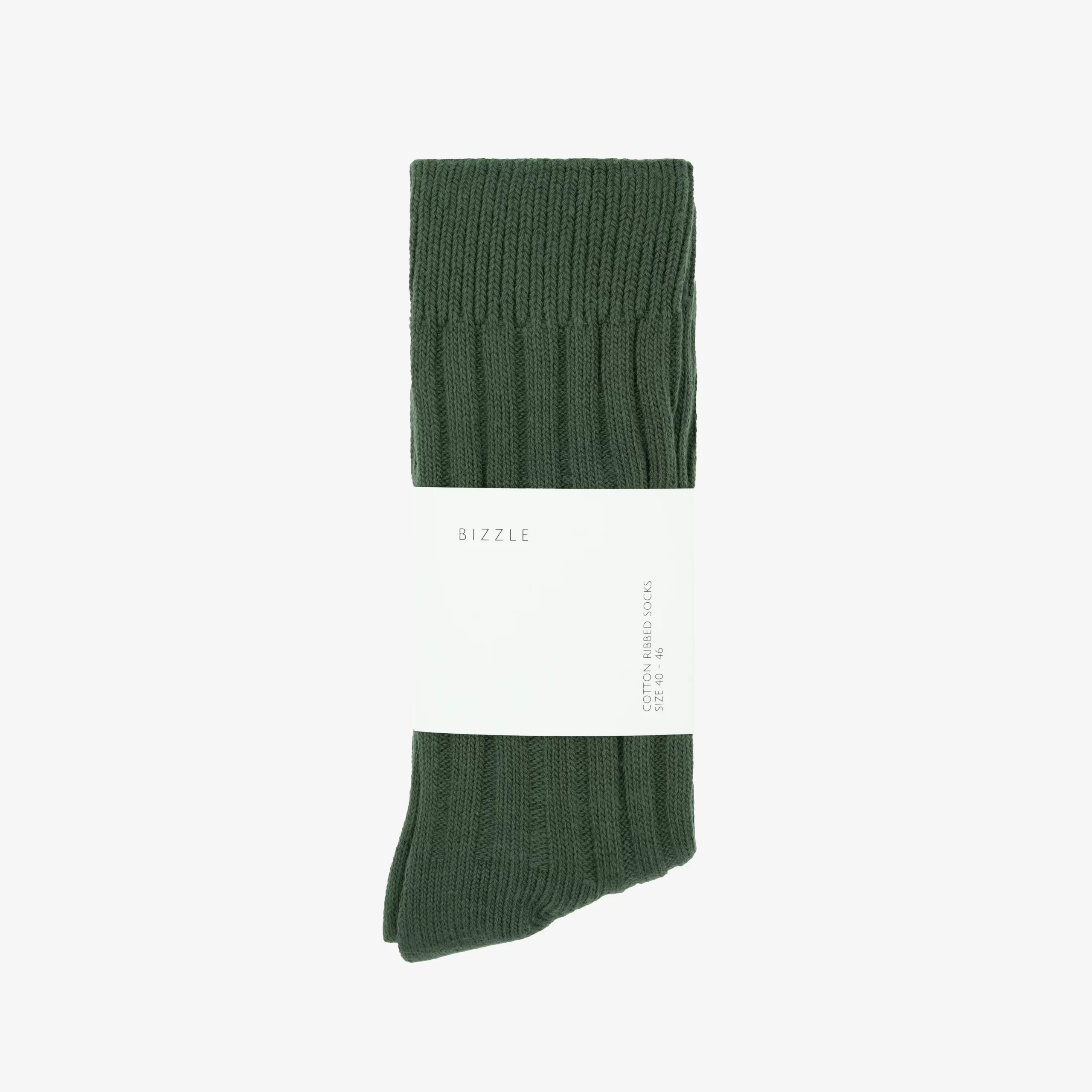 Bizzle ribbed socks forest Green. Sizing to fit 40-46 EU. Universal classic for every season. No visible brand logo. Manufactured in China following premium standards. MATERIAL: 85/cotton, 13/polyester, 2/spandex. Designed by BIZZLE.