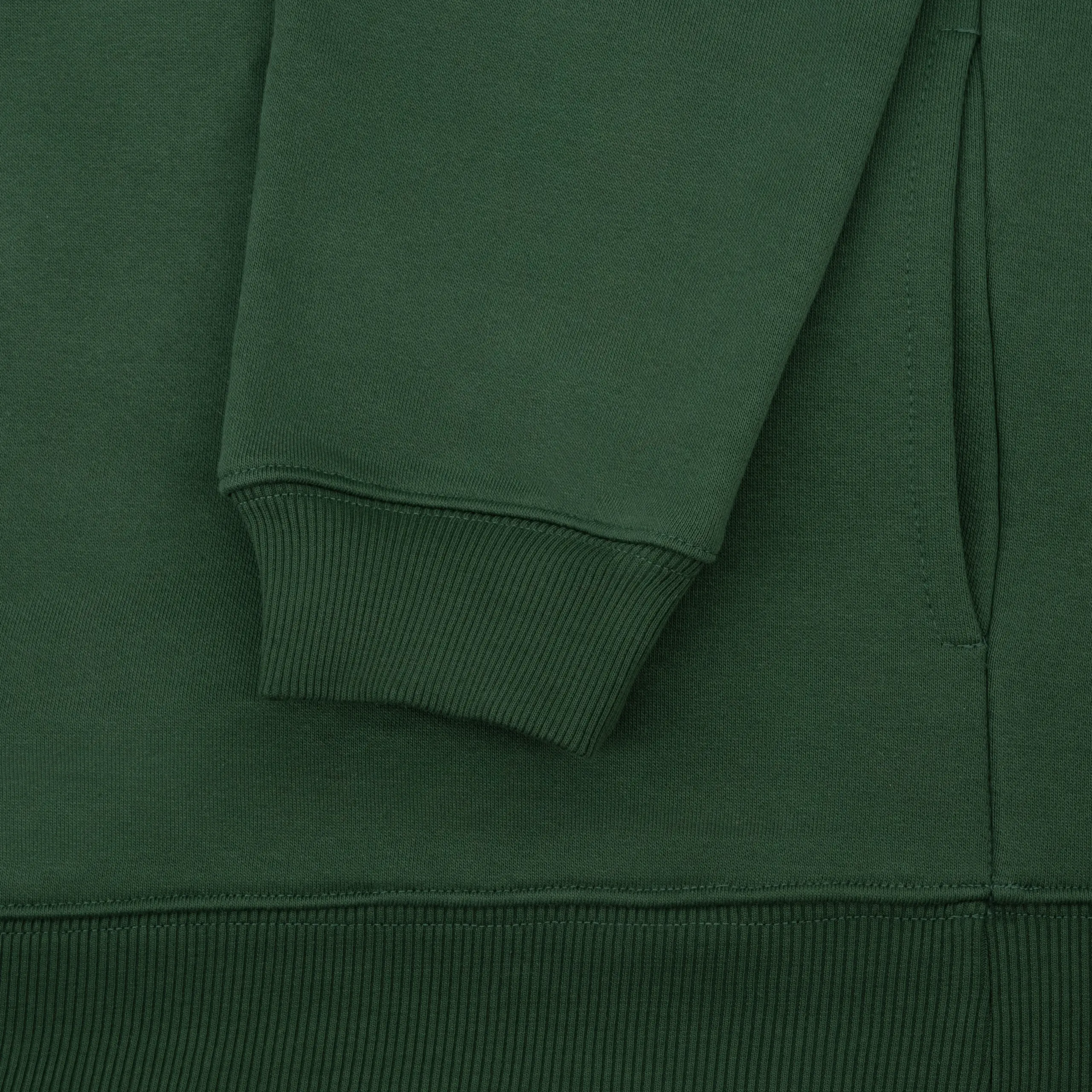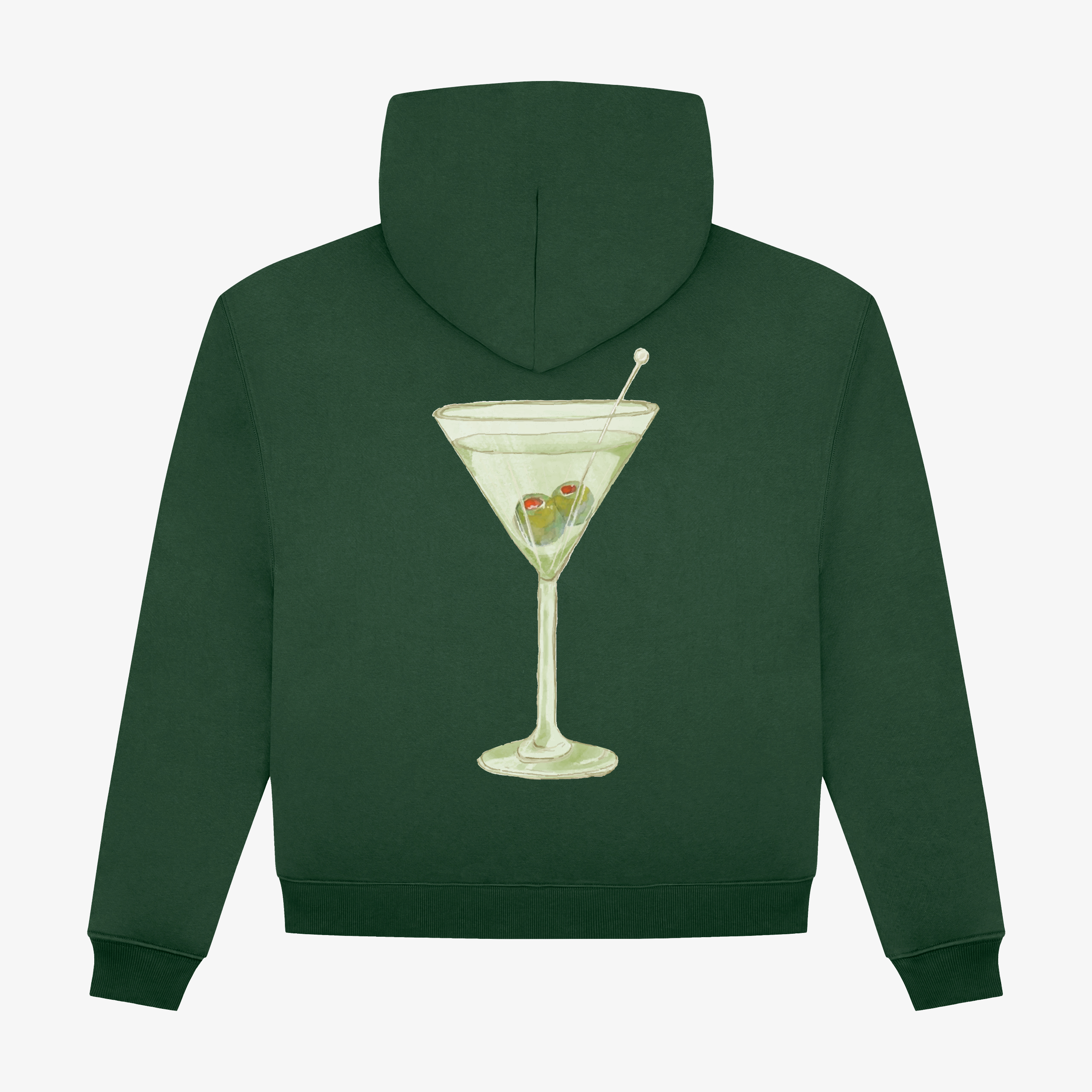 Oversized hoodie made of heavyweight organic cotton in ivy green. Martini print made using DTF technology. Weight 475 GSM. One-piece hood construction. Label made from recycled materials. Fabric custom-made by a Polish knitting mill. Hand-sewn in a local Polish sewing room. Side pockets hidden in the seam. MATERIAL: 100/ organic cotton. Designed by BIZZLE.